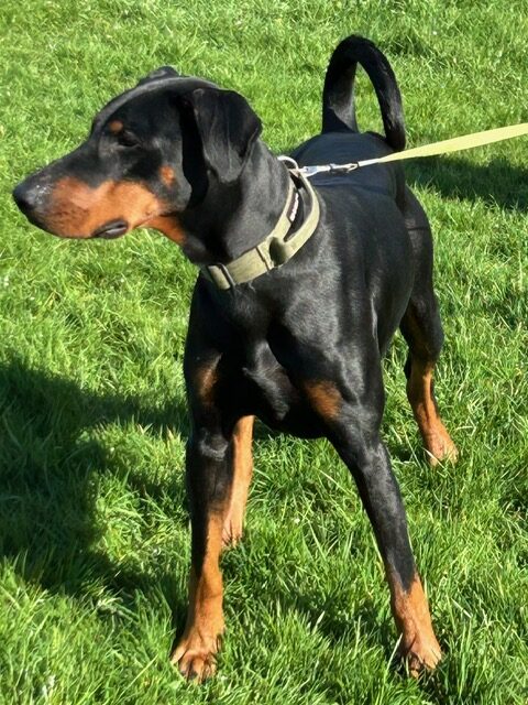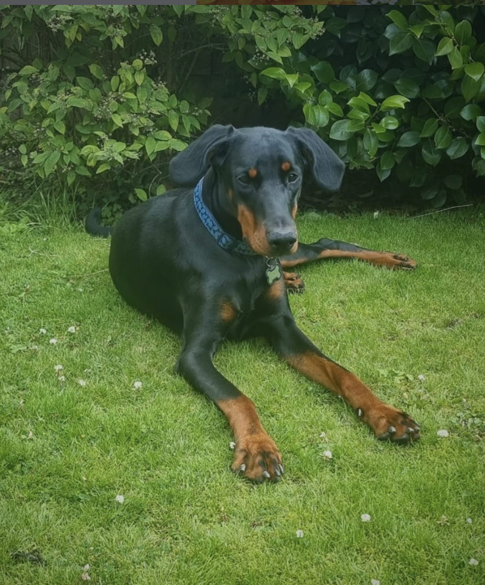 Meet Baby Blue 💙 Baby Blue is a 9-month-old female black and tan Dobermann who is coming into Lincs due to her owner’s ill health. Sadly, because of these health challenges, Blue hasn’t been able to receive the exercise, training, and structure that a young Dobermann needs to thrive. As